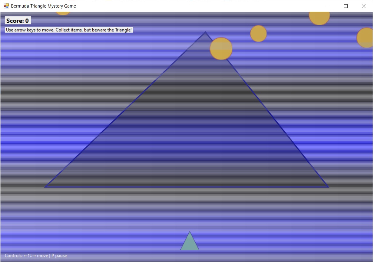 Gameplay: move a ship with arrow keys, collect objects, watch what happens when objects enter the Triangle region, and read short explanations/hypotheses.