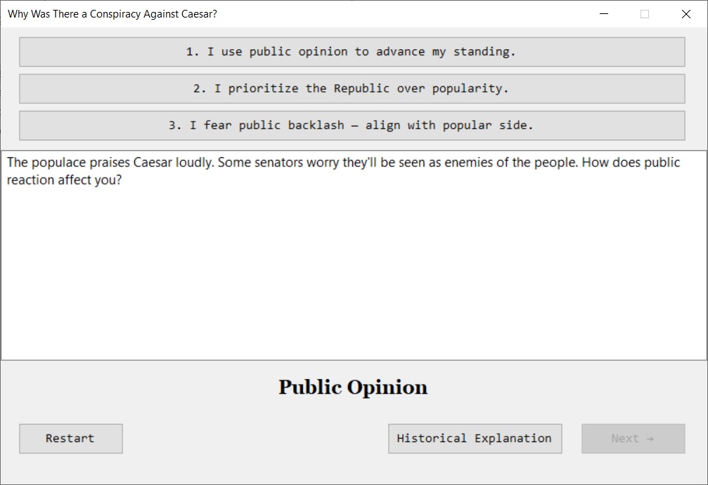 Description Educational interactive game that explores motives behind the conspiracy against Julius Caesar (fear of monarchy, concentration of power, personal rivalries, ideology)
