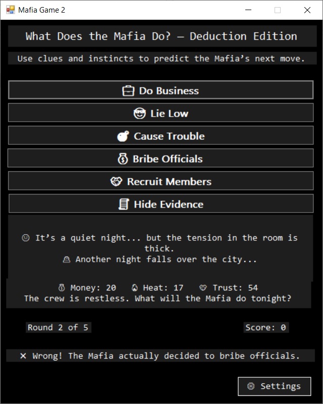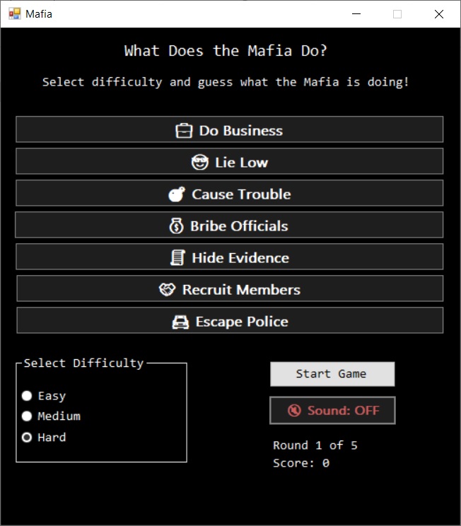 Text-based Windows game called “What Does the Mafia Do?” — where the player tries to guess what the Mafia is doing that night. A fun beginner-friendly game.
