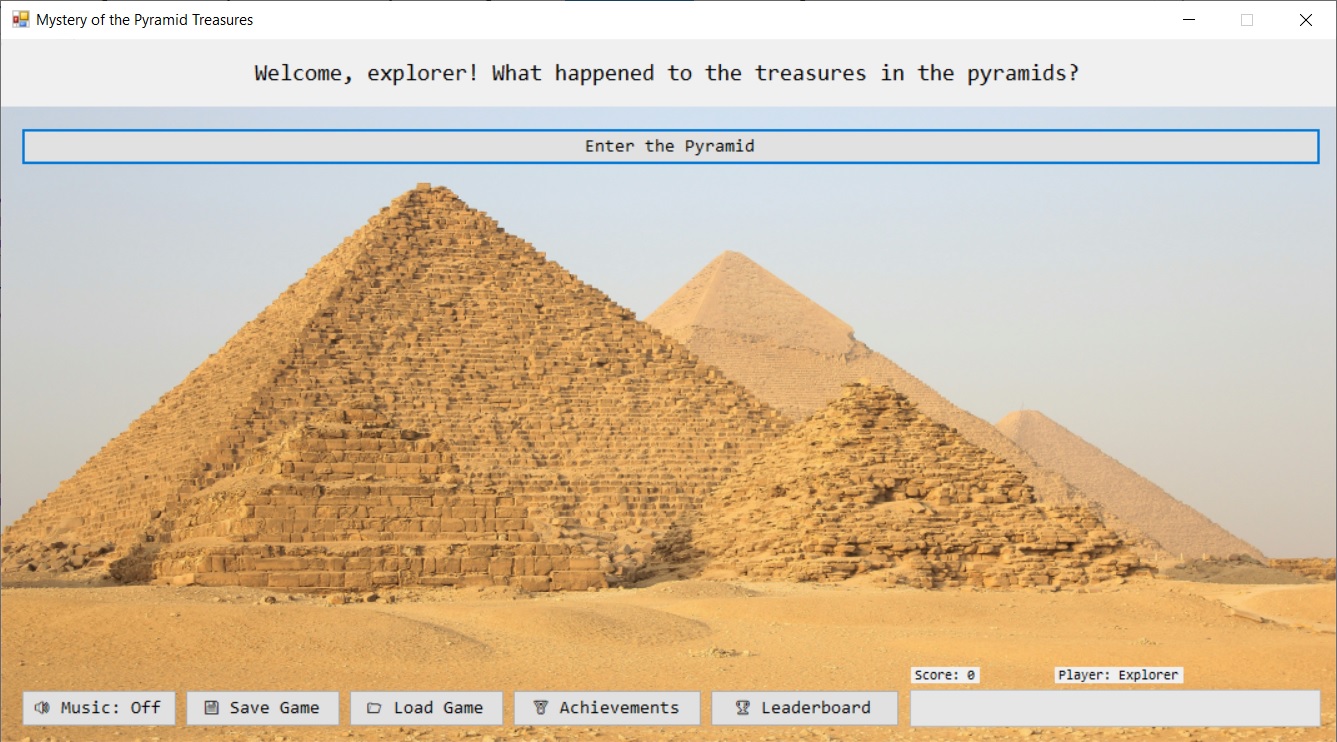 Simple Windows game called "Mystery of the Pyramid Treasures" — a short interactive story/quiz game where the player explores a pyramid, answers questions, and discovers what happened to the treasures.